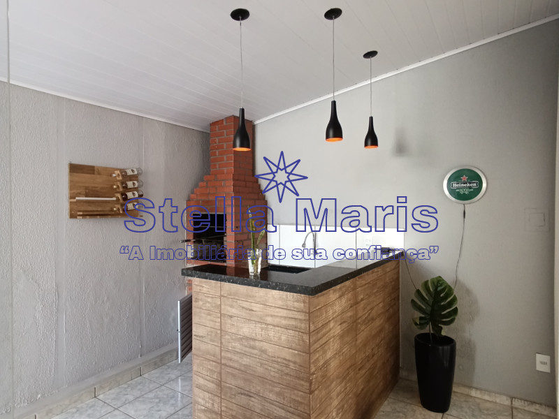 . .Garagem coberta, com portão eletrônico .Are Gourmet com churrasqueira e cozinha externa .Sala de TV com iluminação exclusiva .Cozinha planejada, toda em mármore .Dois dormitórios, sendo uma suíte .Banheiro social .Lavanderia coberta .Laje e piso frio .