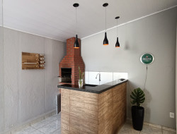 . .Garagem coberta, com portão eletrônico .Are Gourmet com churrasqueira e cozinha externa .Sala de TV com iluminação exclusiva .Cozinha planejada, toda em mármore .Dois dormitórios, sendo uma suíte .Banheiro social .Lavanderia coberta .Laje e piso frio .